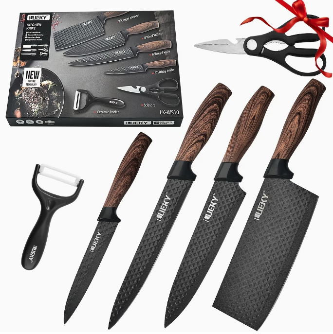 - Knife handles: composite material with wood-texture finish